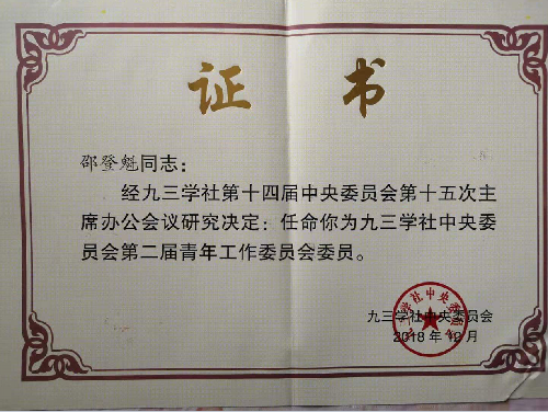2018年年底,九三學(xué)社中央各專(zhuān)委會(huì)進(jìn)行了換屆選舉,近日收到九三學(xué)社中央通知和證書(shū),農(nóng)林支社社員邵登魁經(jīng)九三學(xué)社省委推薦,經(jīng)九三學(xué)社第十四屆中央委員會(huì)第十五次主席辦公會(huì)議研究決定,被正式任命為九三學(xué)社中央委員會(huì)第二屆青年工作委員會(huì)委員。本屆社中央青年工作委員會(huì)委員共有來(lái)自全國(guó)30個(gè)省市自治區(qū)108名委員,青海省有2名社員入選。(九三學(xué)社農(nóng)林支社報(bào)道)