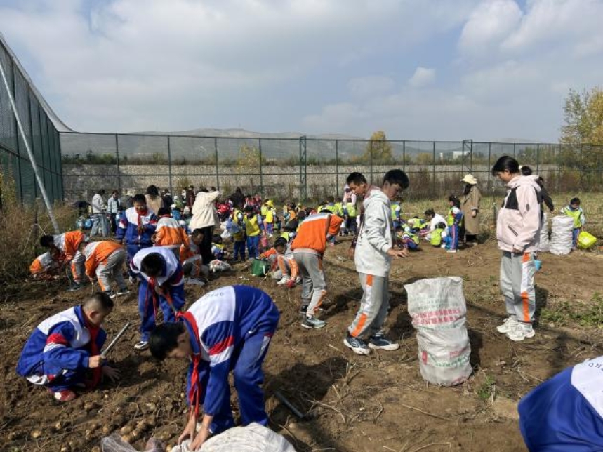 活動以“挖土豆”為主要實踐內(nèi)容,學生在教師指導下深入試驗基地,親手參與土豆采收。過程中,學生不僅了解了土豆的基本生長特性、種植環(huán)境及采收方法,還在實際操作中體會到農(nóng)業(yè)勞動的艱辛與收獲的喜悅。學生們分工協(xié)作,挖掘、收集、裝筐各司其職,默契配合。
